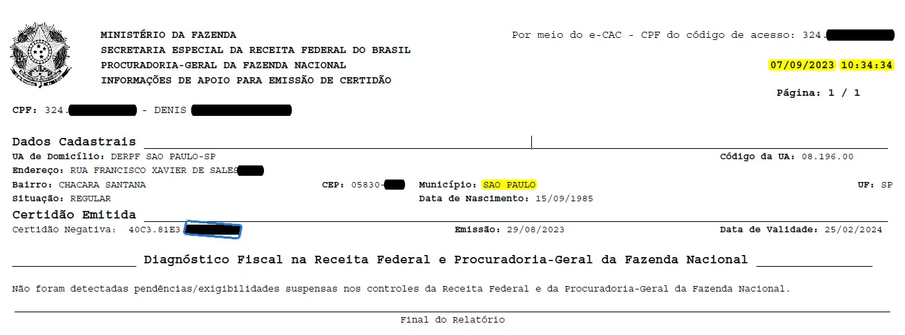 Comumente após o processamento da DSDP com endereço no exterior, ao emitir a situação fiscal o relatório demonstra o novo endereço no exterior declarado.