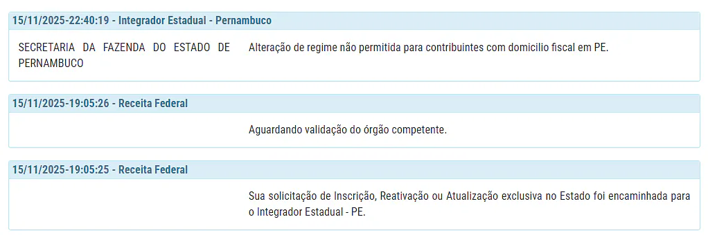 A IE está apresentando restrição com o status “Vedada operação como destinatário na UF”. Trata-se de uma empresa recente (aberta em 03/10/2025), SEM DÉBITOS, COM TODAS AS DECLARAÇÕES EM DIA e enquadrada no Simples Nacional, a IE está Ativa, mas com essa restinção.